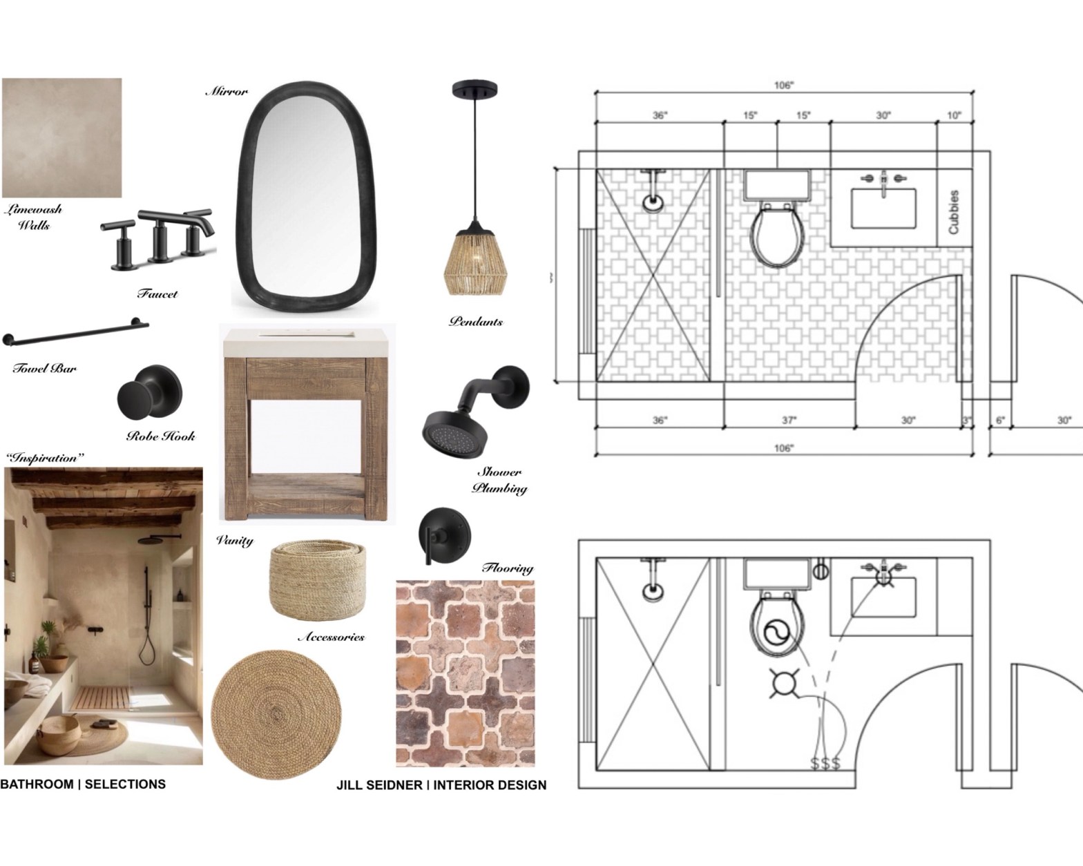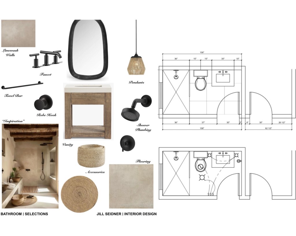 It’s a small bathroom in a downstairs basement area. The original idea is that it would retain the Spanish style look that is consistent with the rest of the house and architecture, but also be a bathroom for her husband with some slightly more masculine touches (matte black hardware).