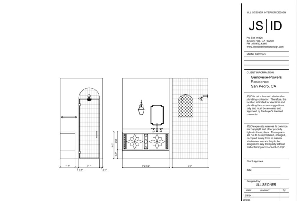 For the vanity design, the client found a vanity style she liked and I replicated it to create a custom floating vanity. We incorporated a mirror that complements the Spanish Revival style and a lantern for sconces inspired by a concept photo I had suggested.
