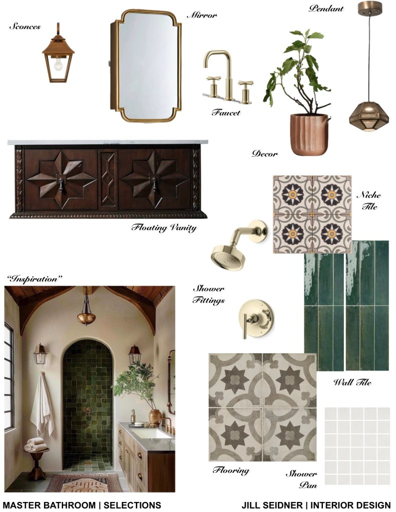 For the finish selections, I created a concept board inspired by a photo and incorporated color and concrete tiles with a pattern to compliment the Spanish style to make this small bathroom truly stand out.